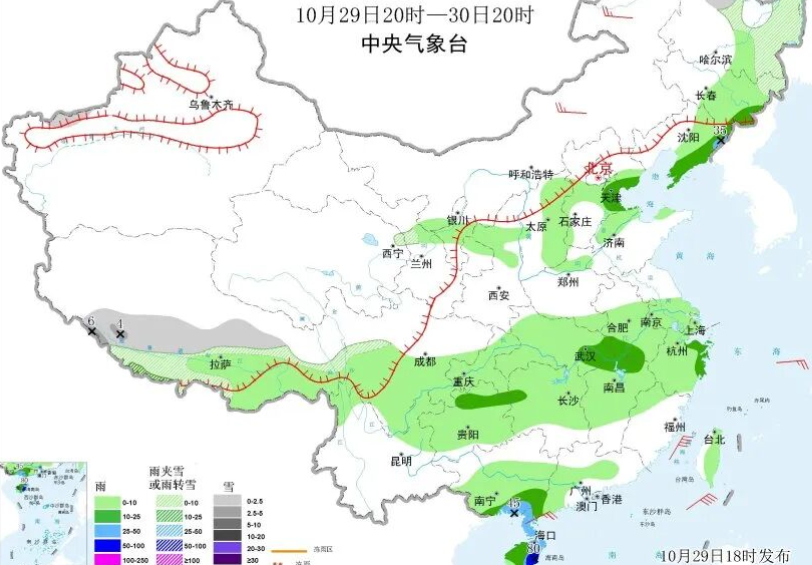 黑龙江东部和北部、吉林东北部、西藏中南部、川西高原北部等地部分地区有小到中雪或雨夹雪。吉林东南部、辽宁东部和南部、河北东北部、天津中南部、安徽西南部、湖北东部、湖南西部、江西北部、浙江东部、贵州东北部、广西南部、广东西南部、海南岛等地部分地区有中到大雨。